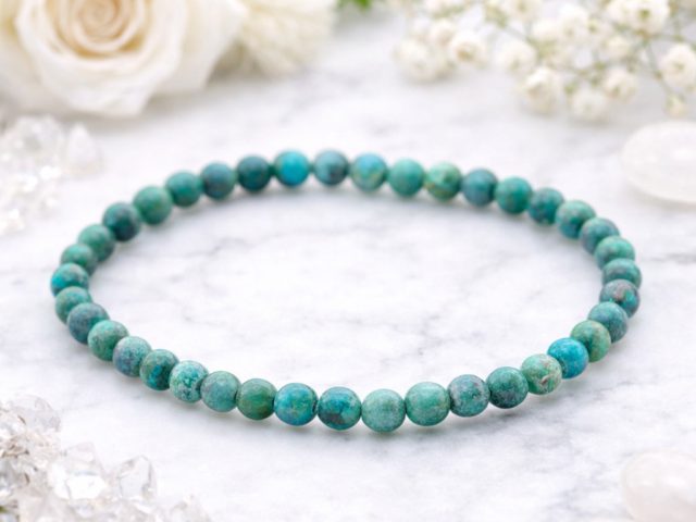 Pierre de réconfort et d’harmonie, la chrysocolle est traditionnellement associée à l’énergie du féminin. Ce bracelet est un allié durant les périodes de règles douloureuses. La chrysocolle aide à l’apaisement des tensions émotionnelles et au soutien du féminin sacré.