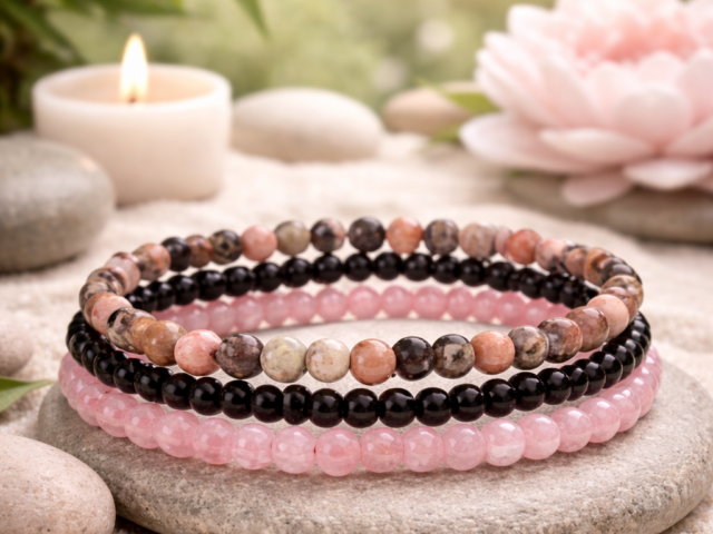 Onyx – rhodonite – quartz rose. Ce bracelet vous donnera de l’assurance et de la stabilité. Il aide lors de chocs émotionnels, d’angoisses et de peurs diverses à guérir les blessures du chakra du coeur. Il régule également la tension artérielle.