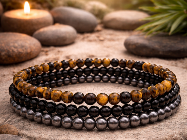 Oeil de tigre – hématite – onyx. Ce bracelet apporte protection et enracinement. Capacité à s’imposer. Régule le système nerveux et l’oreille interne.