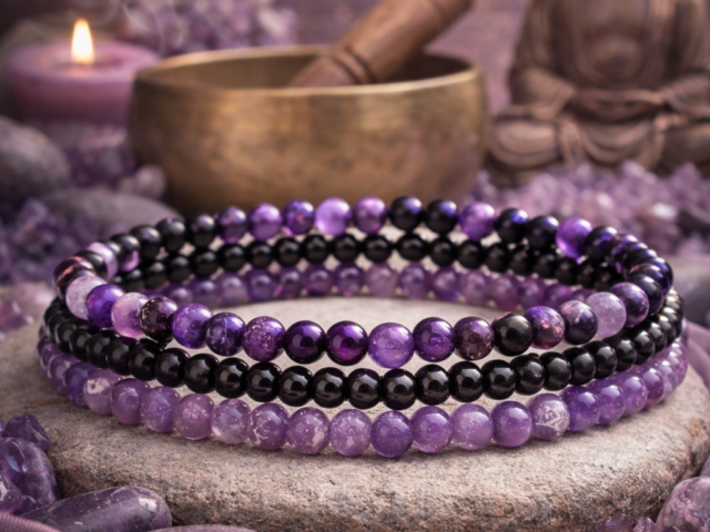 Améthyste – onyx noir – agate violette. Correspond au chakra couronne, appporte spiritualité et calme les anxiétés ou angoisses. Ce bracelet aide à s’ouvrir aux autres avec douceur.